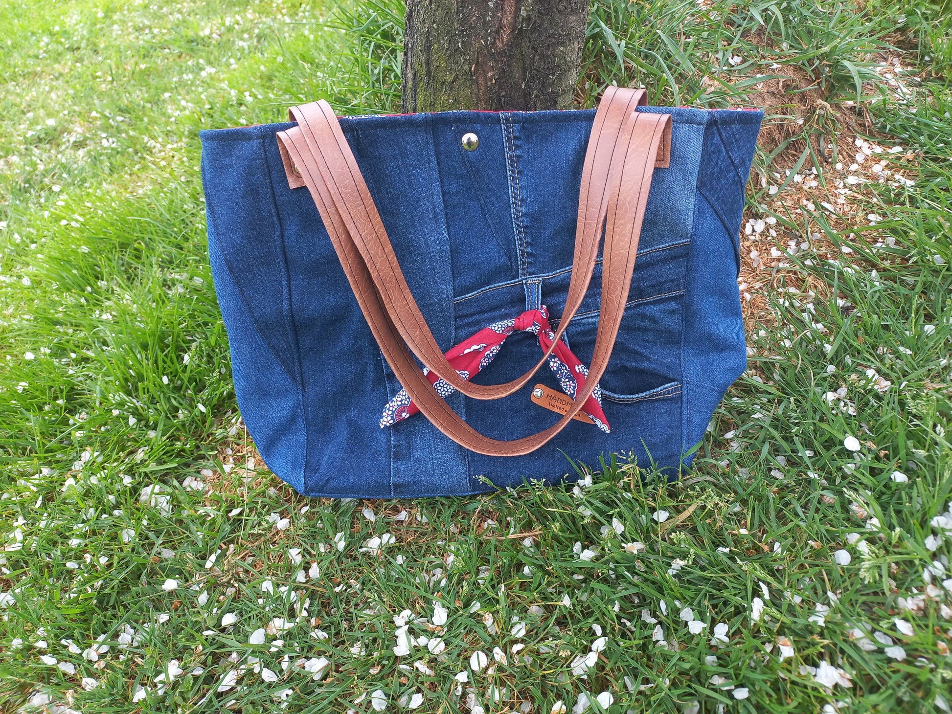 Sacs cabas en jeans recyclé ♻️ et intérieur coton rouge et imprimé éventails.